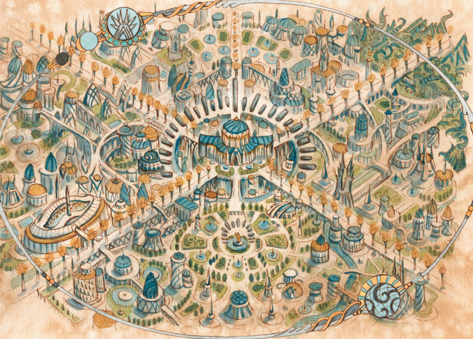 After ten minutes of focused ritual, he finds himself grabbing at a blue line in the sky, and suddenly he is dragged forward. The skyline rushes into view. Individual pieces of rock float freely in the air, spread out before him like a fractured cityscape. Below lies something like an archway plaza, with a massive statue at its center. Off to one side stands the Biblioplex—or what he assumes must be the Biblioplex. Somehow, inexplicably, he already has knowledge of this place. The sigils on his arms glow faintly beneath his gloves, and that glow feels connected to this sudden certainty. Everything looks magnificent.